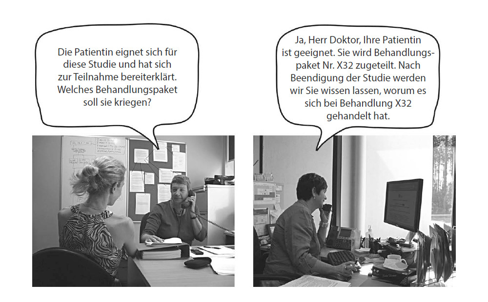 Diese verdeckte Behandlungszuteilung wird normalerweise erstens durch die Erstellung von Zuteilungsschemata erreicht, die weniger vorhersehbar sind als die einfache wechselweise Zuordnung – zum Beispiel dadurch, dass die Zuteilung auf Zufallszahlen beruht – und zweitens durch Geheimhaltung dieses Schemas. Um die Zuteilungsschemata geheim zu halten, kann man verschiedene Methoden anwenden. So kann die Zufallszuteilung beispielsweise bei einem Patienten, der sich für die Teilnahme an der Studie eignet, «aus der Ferne» – d. h. per Telefon oder Computer – erfolgen (Abb. 8). Eine weitere Möglichkeit stellt die Verwendung einer Serie von nummerierten Umschlägen dar, die jeweils eine Zuteilung enthalten. Ist ein Patient für die Teilnahme geeignet, wird jeweils der nächste Umschlag in dieser Serie geöffnet, um zu sehen, welcher Gruppe er zugeteilt wird. Damit dieses System funktioniert, müssen die Umschläge undurchsichtig sein, damit die Ärzte nicht «schummeln » können, indem sie den Umschlag gegen das Licht halten, um die Zuteilung darin zu erkennen.